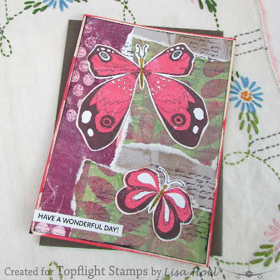 This week at Topflight Stamps our theme is "Butterflies". The store has a whole section devoted to Butterflies/Moths so check it out! I created a mixed media card featuring the Studio Light Layered Butterflies stamp set. The background is a collage of gel print pieces.