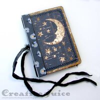 Next I cut two pieces of the blue cork fabric slightly smaller than the covers so there would be a border of the base fabric. I used the moon and stars dies to cut out the shapes. The "B" is cut using Eileen's retired Block/Cube/Bank 3-D Die