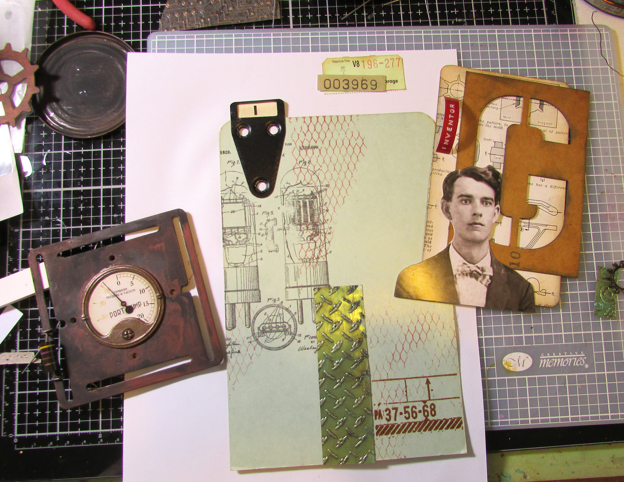 "I" is for inventor and "G" is for gadgets! I had a lot of fun with this industrial assemblage. I rummaged through my stash of "found objects with possibilities" and the recycling bin!